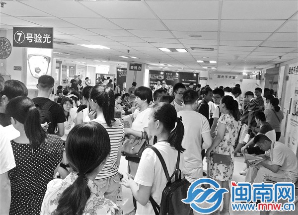 廈門眼科中心候診大廳擠滿陪同來(lái)做近視激光手術(shù)患者的家屬