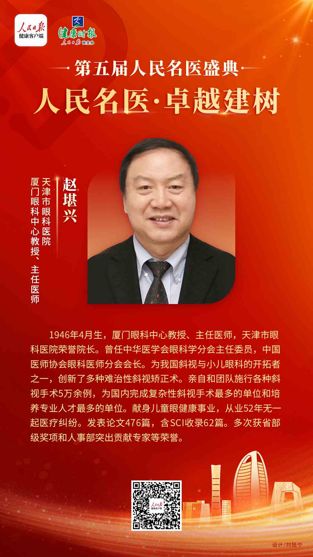 8月16日,由人民日?qǐng)?bào)健康客戶端、健康時(shí)報(bào)主辦的第五屆人民名醫(yī)盛典于線上舉行,會(huì)上發(fā)布了備受業(yè)內(nèi)關(guān)注的人民名醫(yī)系列榜單。其中,廈門(mén)眼科中心國(guó)際眼科科學(xué)院院士趙堪興教授獲“人民名醫(yī)——卓越建樹(shù)”榮譽(yù)稱號(hào)。