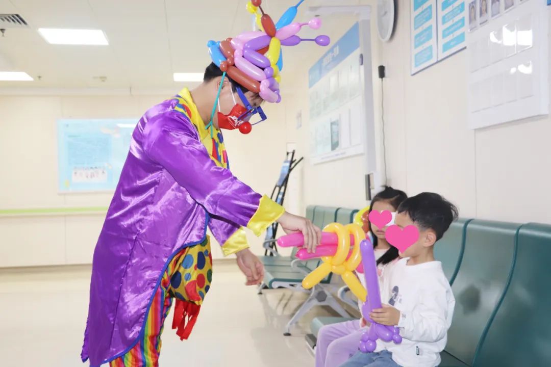在規(guī)范有序的診療工作外,身著小丑服飾的氣球達(dá)人吸引了眾多來院小朋友的目光。