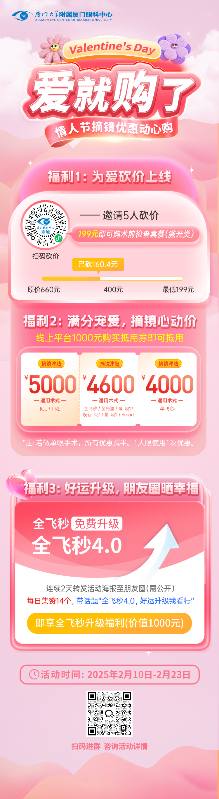 連續(xù)2天轉(zhuǎn)發(fā)活動(dòng)海報(bào)至PYQ(需公開無分組),附文案“全飛秒4.0,好運(yùn)升級(jí)我看行”,每天集贊14個(gè),即享全飛秒升艙福利,以全飛秒3.0價(jià)格完成4.0手術(shù)(優(yōu)惠1000元)。