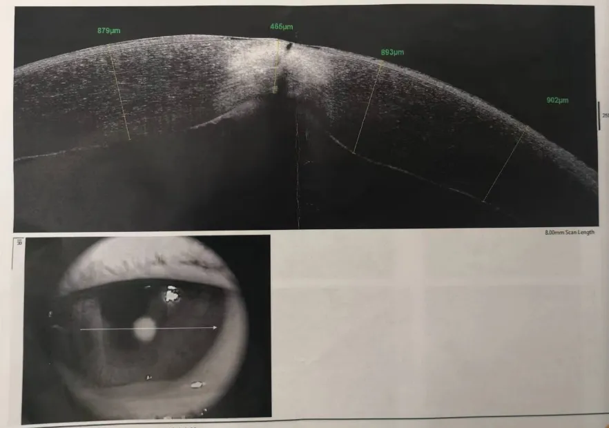 吳護(hù)平主任為小黃安排了詳細(xì)的檢查。經(jīng)過(guò)檢查,我們確認(rèn)了小黃為真菌性角膜潰瘍,在小黃角膜中央偏顳下方角膜上可以看到一個(gè)約2.2mm的類圓形的灰白色浸潤(rùn)病灶,遮蓋了部分瞳孔區(qū),深度可達(dá)4/5角膜厚度,同時(shí)角膜上皮有缺損,基質(zhì)水腫,表面可以看見少量白色分泌物附著。