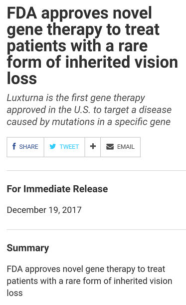 圣誕前夕,從美國傳來了重磅消息:“針對(duì)由RPE65基因突變導(dǎo)致的雷柏氏先天性黑朦2型(RPE65基因突變引起)的基因替代療法藥物L(fēng)uxturna(voretigene neparvovec-rzyl)獲FDA批準(zhǔn)上市!失明患者重見光明為時(shí)不遠(yuǎn)!