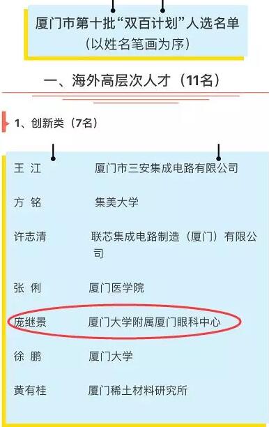 2018年1月25日,廈門市第十批引進(jìn)高層次人才“雙百計劃”人選名單的公告及名單正式公布!歷經(jīng)半年時間申報、初審、網(wǎng)絡(luò)評審、現(xiàn)場答辯、市高層次人才引進(jìn)專項小組會議研究和公示等層層篩選,最終世界眼遺傳病基因治療專家、華廈