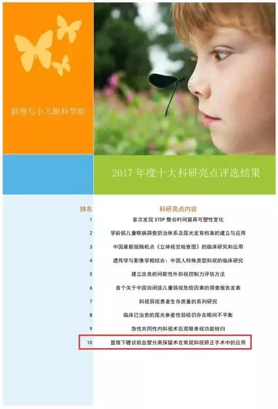 日前,由我院潘美華教授領(lǐng)銜的項目“顯微下睫狀前血管分離保留術(shù)在常規(guī)斜視矯正手術(shù)中的應(yīng)用”成功入選中華醫(yī)學(xué)會斜視與小兒眼科學(xué)組“2017年十大科研亮點”。