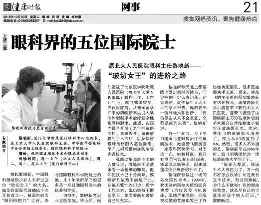 2018年10月30日,人民日?qǐng)?bào)社屬報(bào)紙《健康時(shí)報(bào)》對(duì)廈門大學(xué)附屬廈門眼科中心總院長(zhǎng)黎曉新進(jìn)行大篇幅報(bào)道。