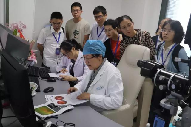 在廈門眼科中心五緣院區(qū)學(xué)員們觀摩了與眼科學(xué)發(fā)展息息相關(guān)的各類前沿的光學(xué)設(shè)備,包括德國(guó)OCT3光學(xué)相關(guān)斷層掃描儀、ZEISS眼底相干光層析血管成像儀OCTA、 ZEISS VISULAS:YAG眼科激光治療儀、英國(guó)歐寶全景200廣角激光眼底照相機(jī)等各類前沿的特檢設(shè)備。