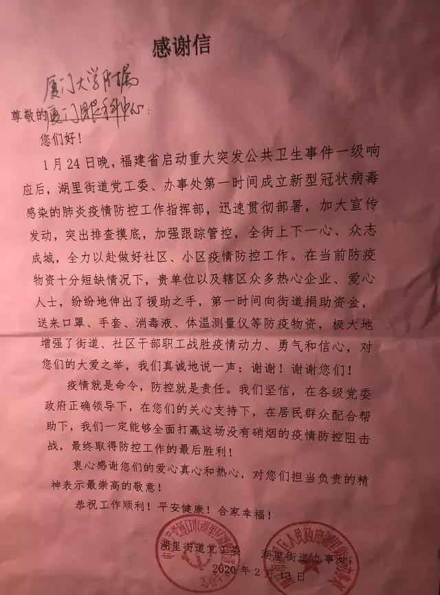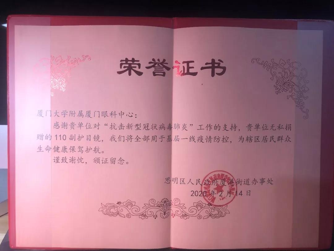 在中華街道辦,街道在LED大屏上打上了“感謝廈門大學(xué)附屬?gòu)B門眼科中心向中華街道捐贈(zèng)護(hù)目鏡”;廈港街道辦為醫(yī)院頒發(fā)了榮譽(yù)證書(shū);還有湖里街道辦、金山街道辦等街道也寫(xiě)了一封封誠(chéng)摯的感謝信。
