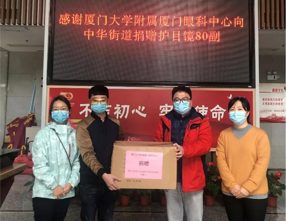 “主任您好,你們辛苦了。這是我們廈門大學(xué)附屬?gòu)B門眼科中心捐贈(zèng)的護(hù)目鏡,請(qǐng)您代表貴街道接收。相信我們會(huì)戰(zhàn)勝疫情,迎來(lái)美好的春天!”