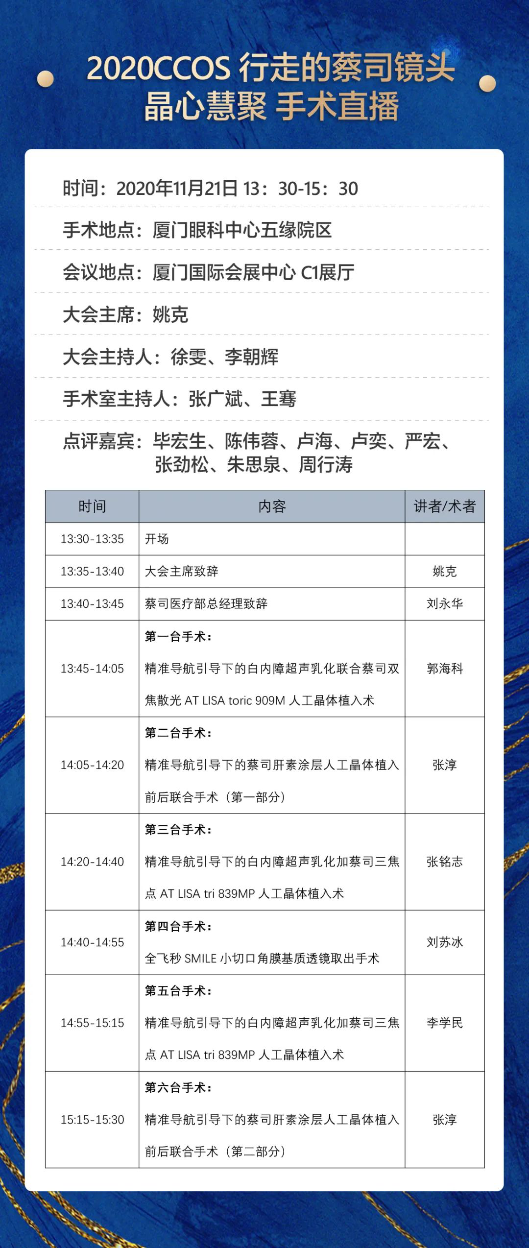 11月21日至22日,在全國(guó)眼科年會(huì)(2020CCOS)期間,4場(chǎng)眼科手術(shù)實(shí)操技術(shù)“云課堂”將精彩上演。面向全國(guó)眼科同道直播的近20臺(tái)手術(shù),將全部在廈門(mén)眼科中心五緣院區(qū)完成。