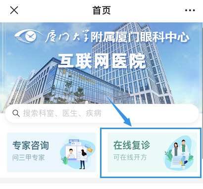“廈門眼科中心互聯(lián)網(wǎng)醫(yī)院”一站式解決掛號難、繳費(fèi)難、取藥難等困擾!更開通網(wǎng)上復(fù)診通道,同步門診歷史記錄,幫助醫(yī)生診療,實(shí)現(xiàn)在線復(fù)診!