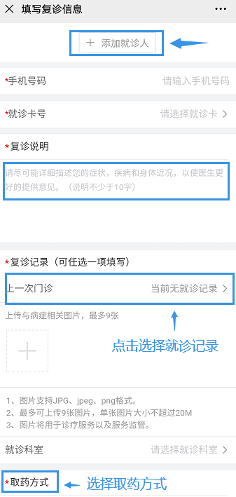 填寫就診人信息、復(fù)診說明,對醫(yī)生詳細(xì)描述目前的癥狀;在復(fù)診記錄中,可以添加往期復(fù)診記錄,以便醫(yī)生快速了解病史
