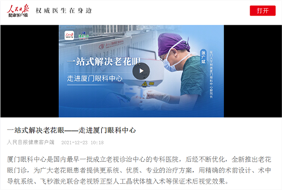 人民日?qǐng)?bào)走進(jìn)廈門眼科中心,專題報(bào)道老花眼診療,張廣斌院長受邀做專題采訪。海西晨報(bào)、海峽導(dǎo)報(bào)、東南早報(bào)、健康時(shí)報(bào)、今日頭條、百度健康、騰訊視頻、愛奇藝、新浪微博等十余個(gè)平臺(tái)聯(lián)袂報(bào)道!