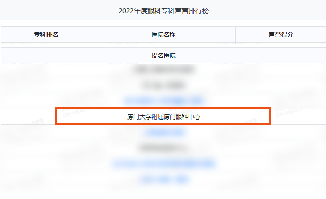 眼科醫(yī)院千余家,排行榜僅公布排名靠前的20家眼科醫(yī)院,廈門眼科中心在全國(guó)多家醫(yī)院的評(píng)選中脫穎而出,并多次上榜,穩(wěn)居??漆t(yī)院第 一方陣,充分凸顯了廈門眼科中心學(xué)科建設(shè)在全國(guó)的競(jìng)爭(zhēng)力和影響力,展現(xiàn)了廈門眼科中心近年來(lái)高質(zhì)量發(fā)展過(guò)程中卓越的臨床醫(yī)療實(shí)力和科研創(chuàng)新能力。