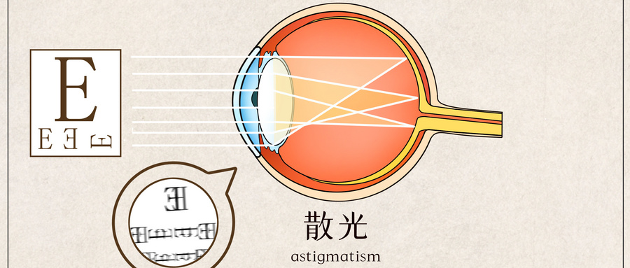 由于角膜形態(tài)或晶狀體等表面不規(guī)則,光線通過眼球折射后無法匯聚成焦點。嚴(yán)重散光者看近看遠(yuǎn)均不清楚。